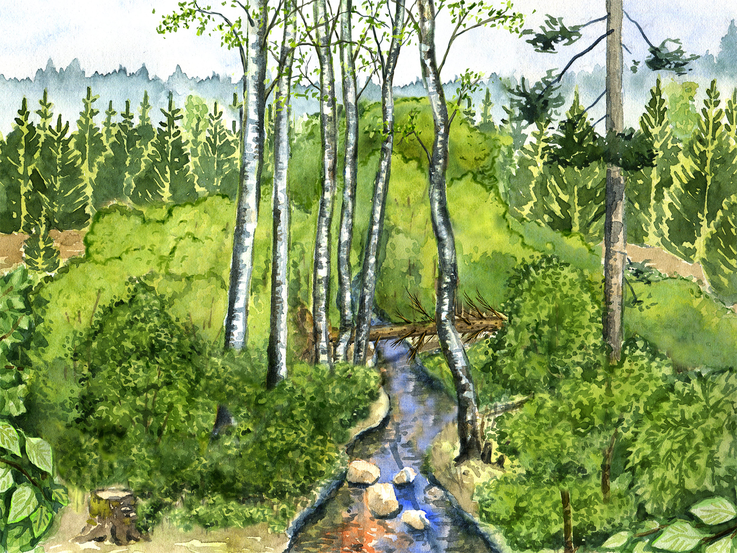 - Orört, men lövdominerat, de fem metrarna närmast vattnet. Rensa bort gran i röjnings- och gallringsfasen så marken blir beväxt med gräs och örter. Vattnet skall i princip alltid vara skuggat av träd eller buskar.