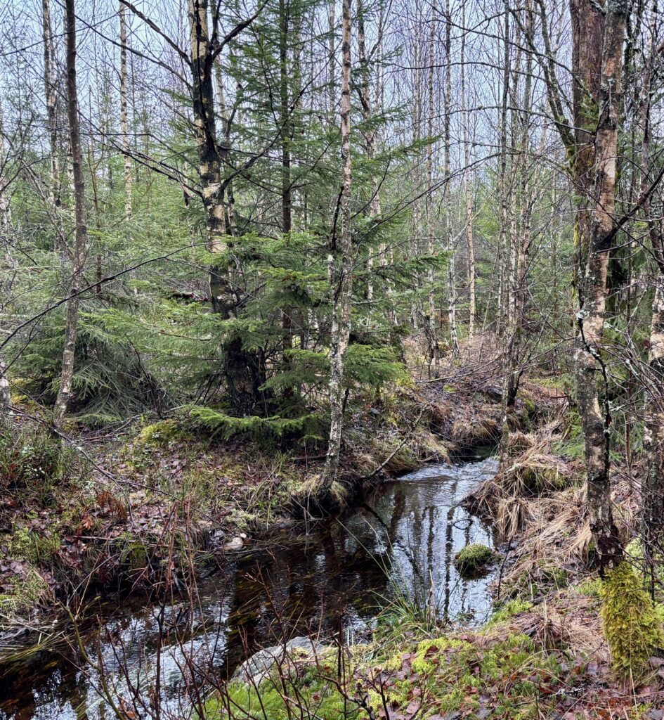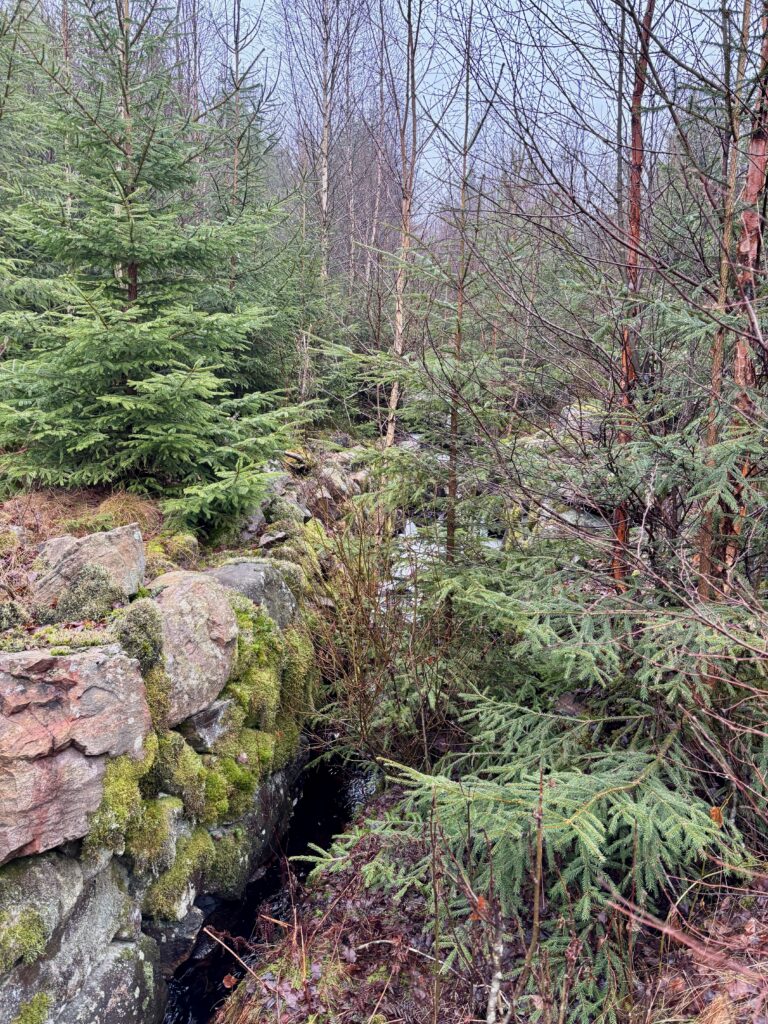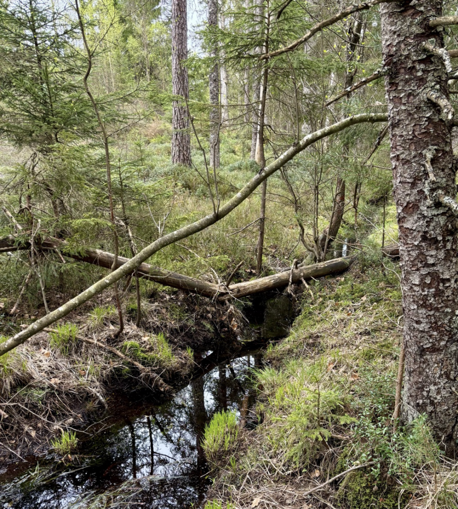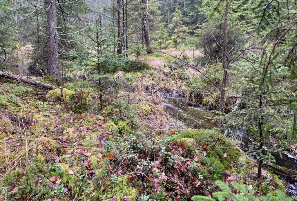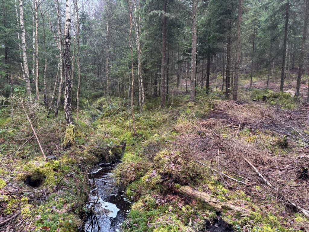 Åtgärd: Här finns möjlighet att röja fram en blandskog, med ökande lövinslag ju närmare bäcken man kommer. Vid kommande gallringar får man planera noga för att inte orsaka körskador.