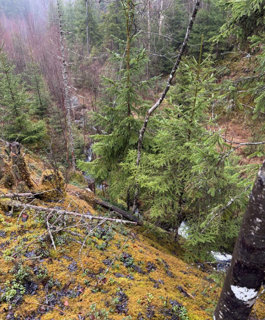 5:3 – En brant sluttning med i stort sett trädslagsren sitka (?) ligger utanför området och påverkar framtida utströmning. Det avfattade området är något mer flackt och har mer inslag av rödgran och björk i åldern runt R2/G1. Närmast bäcken står fortsatt kvar en hel del av den lämnade zonen, med grova granar och äldre alar. Tät självföryngring med gran på sina ställen och en hel del grov död ved ligger i bäcken.